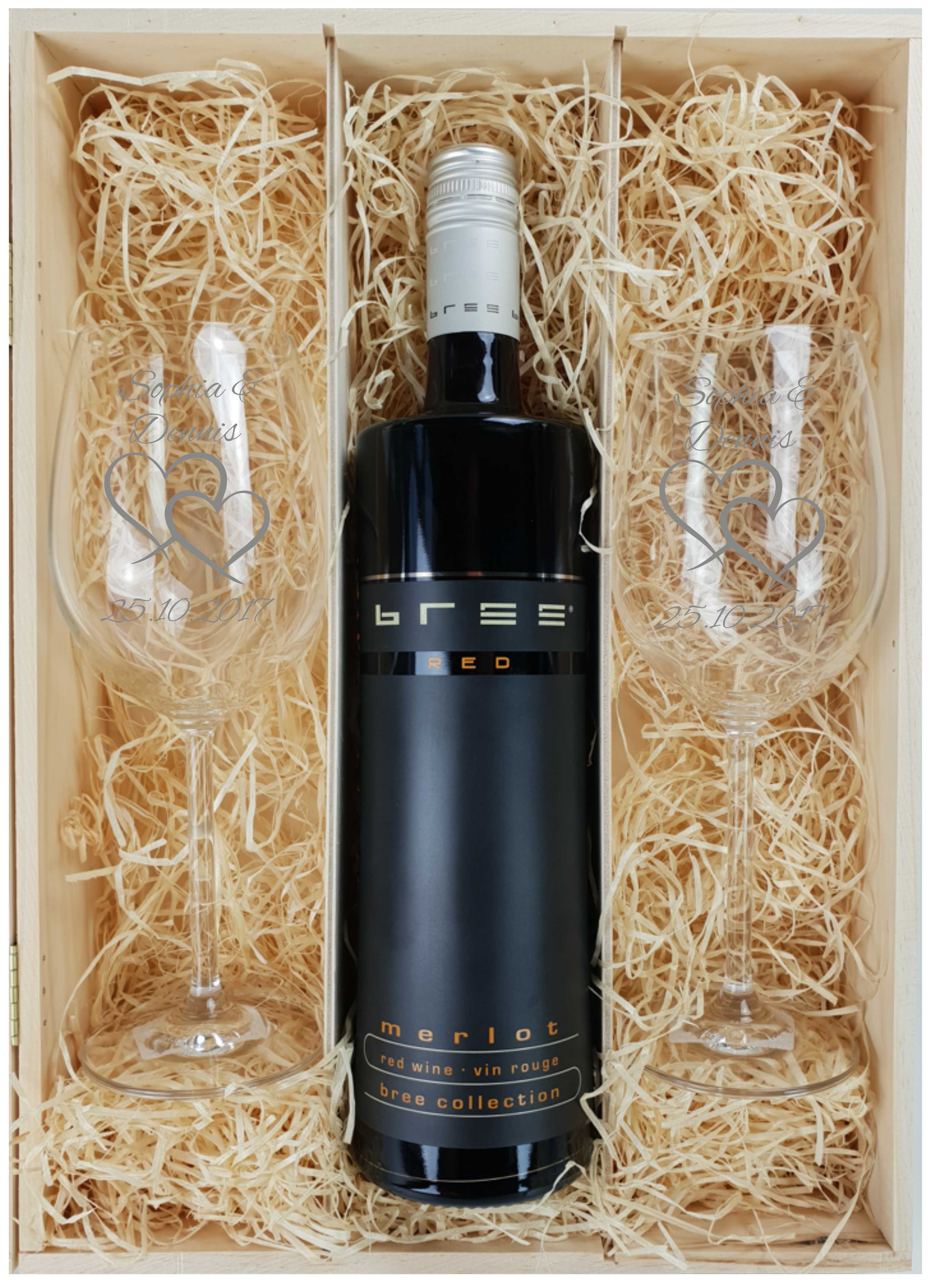 Zwei Gravierte Weinglaser Mit Flasche In Bedruckter Geschenkverpackung Aus Holz Geschenkset