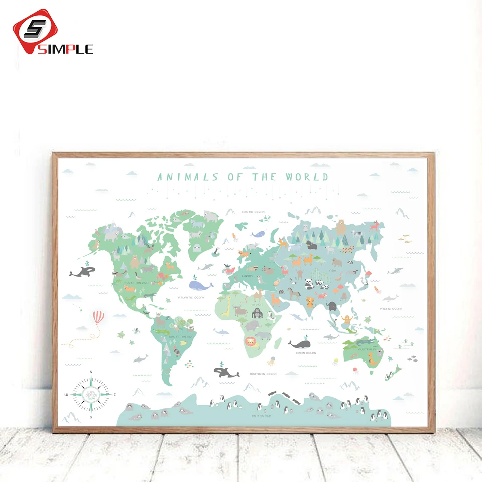 World Map Wall Art Kids Room Nursery Decor Animal World Poster Map Fine Art Center