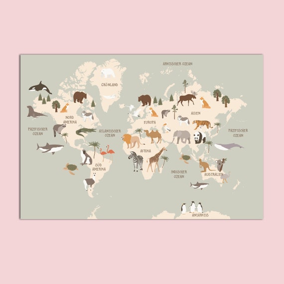 Kids World Map Poster Animal World Map Playroom Wall Decor Etsy