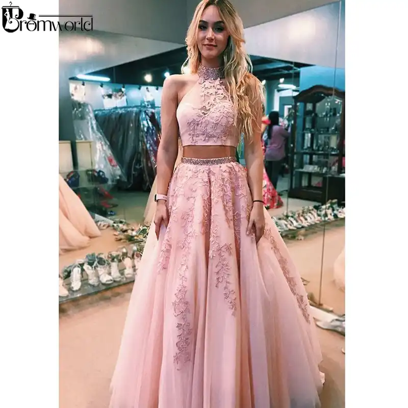 A Line Lace Pink Two Piece Prom Dresses Long Halter Neck Beaded Tulle Open Back Prom Gown Evening Dress Robe De Soiree Prom Dresses Aliexpress