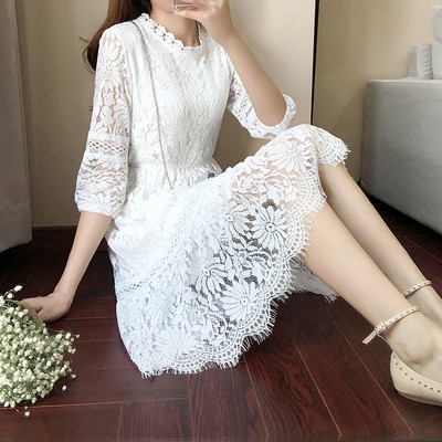 Women White Lace Dress Slim Waist Wedding Bride Bridesmaid Sequins Gown 3 4 Sleeve Dresses Shopee Singapore