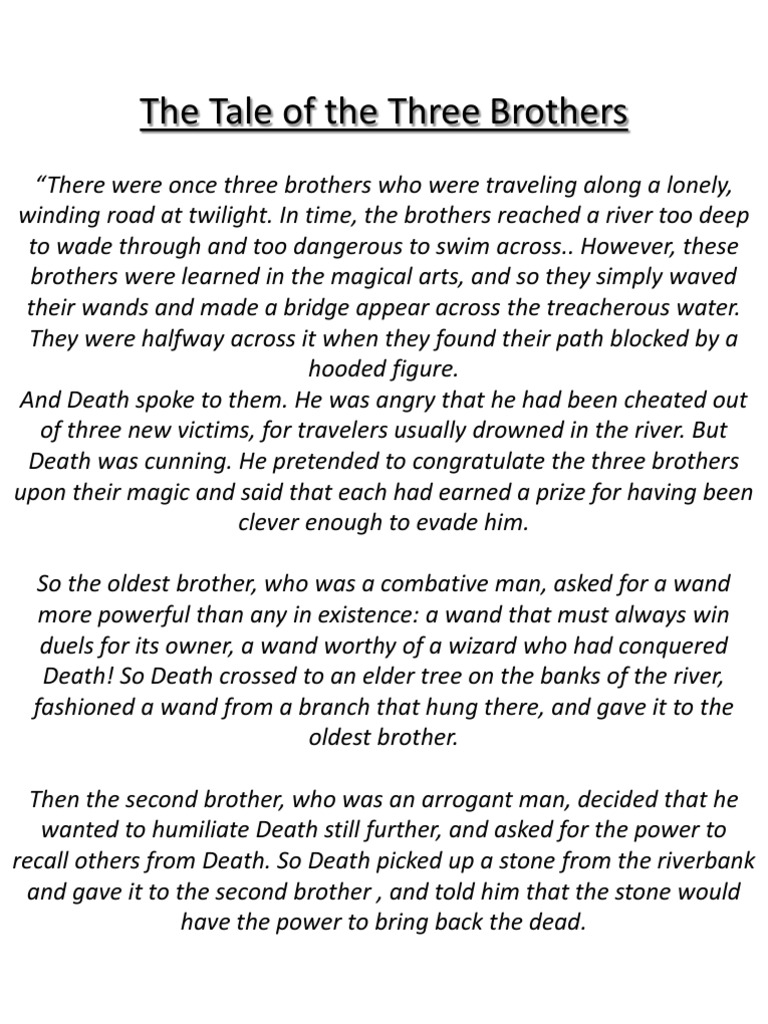 The tale of the three brothers text. The Tale of the Three Brothers was Professor Dumbledore's favorite out of Beedle's stories According to him, the message behind the story is that no matter how hard people try to avoid death, they will never be successful The youngest brother knew that taunting Death would be a useless tactic as Death was a cunning enemy who could never lose. The Tale of the Three Brothers “There were once three brothers who were traveling along a lonely, winding road at twilight In time, the brothers reached a river, too deep to wade through, and too dangerous to swim across. “The Tale of the Three Brothers” is one of the stories in the book “ Tales of Beedle the Bard “, which was left to Hermione by Albus Dumbledore in his will (DH7), and is the original source of the Deathly Hallows legend (DH21).