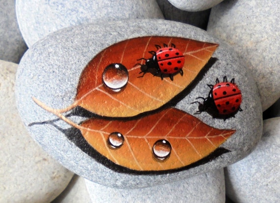 Bemalte Stein Marienkafer Auf Braunen Blattern Wird Mit Etsy
