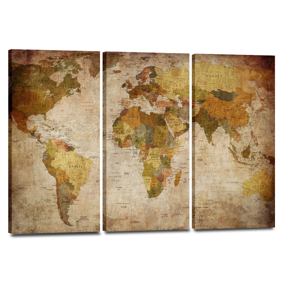 Amazon Com Vintage World Map Canvas Wall Art Retro Print Poster Giclee Painting Modern Artwork Framed And Stretched Pictures For Offices Bedroom Living Room Home Decorations 16 X 32 Inch X 3 Panels