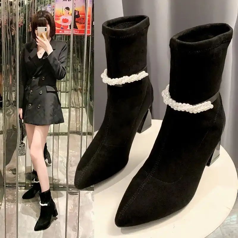 Luxus Marke Stiefel Frauen Schwarz Perle Starke Absatz Mode Schuhe Sexy Party Damen Wildleder Spitzen Stiefeletten Stiefel Botas Mujer Knochel Boots Aliexpress