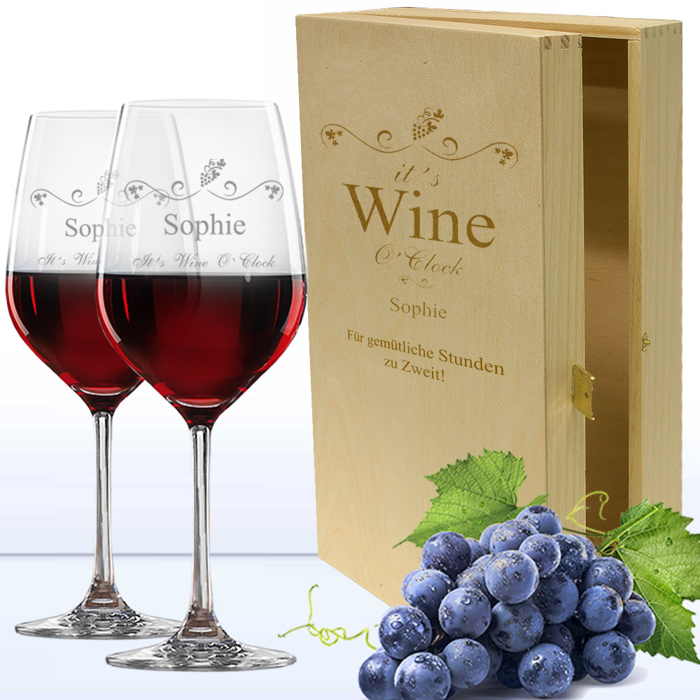 2 Rotweinglaser In 2er Holzkiste Wine O Clock Als Individuelles Geschenk Geschenkplanet