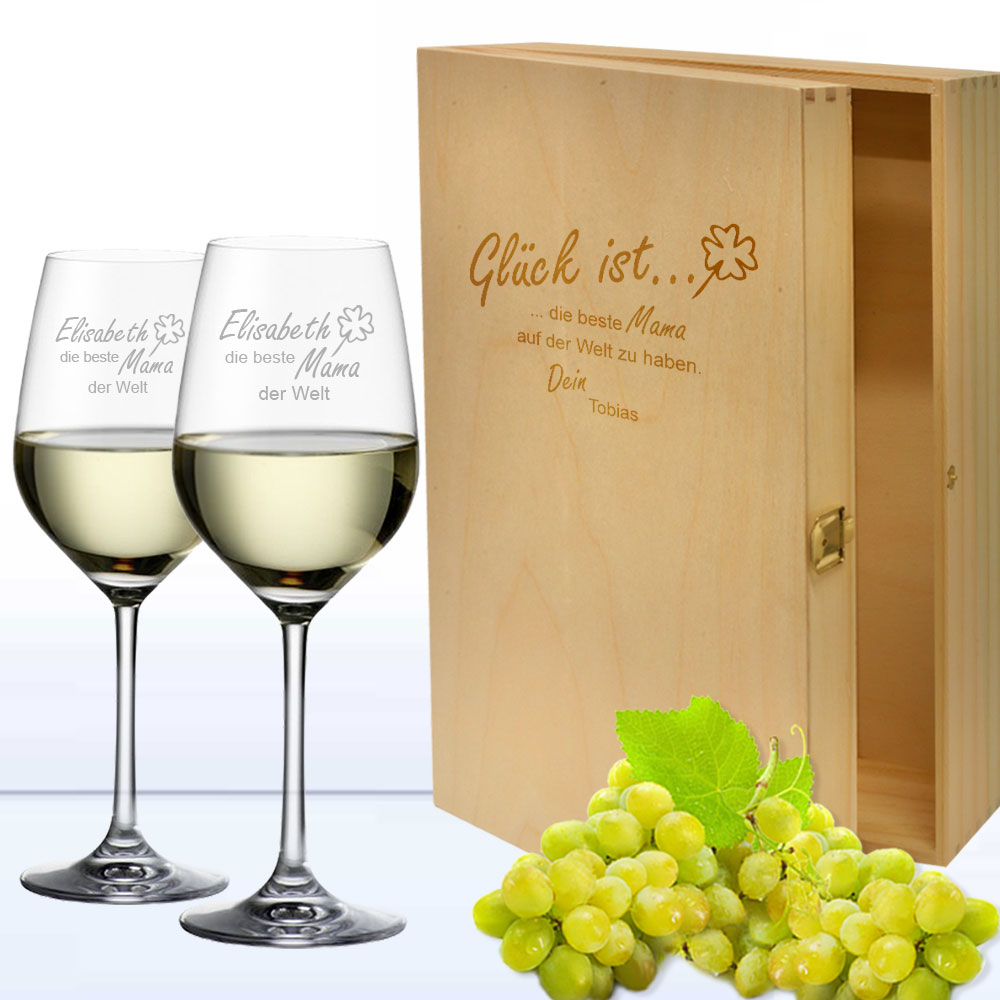 Wein Geschenkset Zur Hochzeit 2 Gravierte Glasern Weisswein In Personlich Bedruckter Holzbox