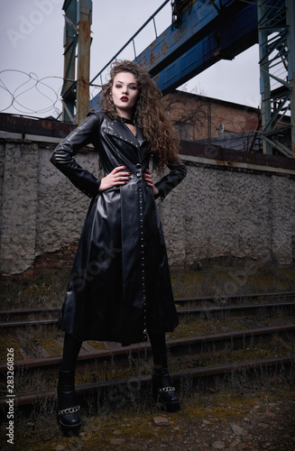 Fashion Shot Portrait Of Cool Rock Girl Informal Model In Leather Coat Standing At Railroad Industrial Area Buy This Stock Photo And Explore Similar Images At Adobe Stock Adobe Stock