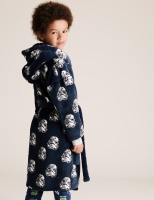 It’s a Jediinspired bathrobe!. This dressing gown features an embroidered Stormtrooper on one of the pockets and the iconic Star Wars logo on the back, so your allegiance to Darth Vader will be clear In true Sith style, this dressing gown has a hood making it ideal for lounging around to watch the most famous galactic franchise. Available in sizes 5 to 13 Years.