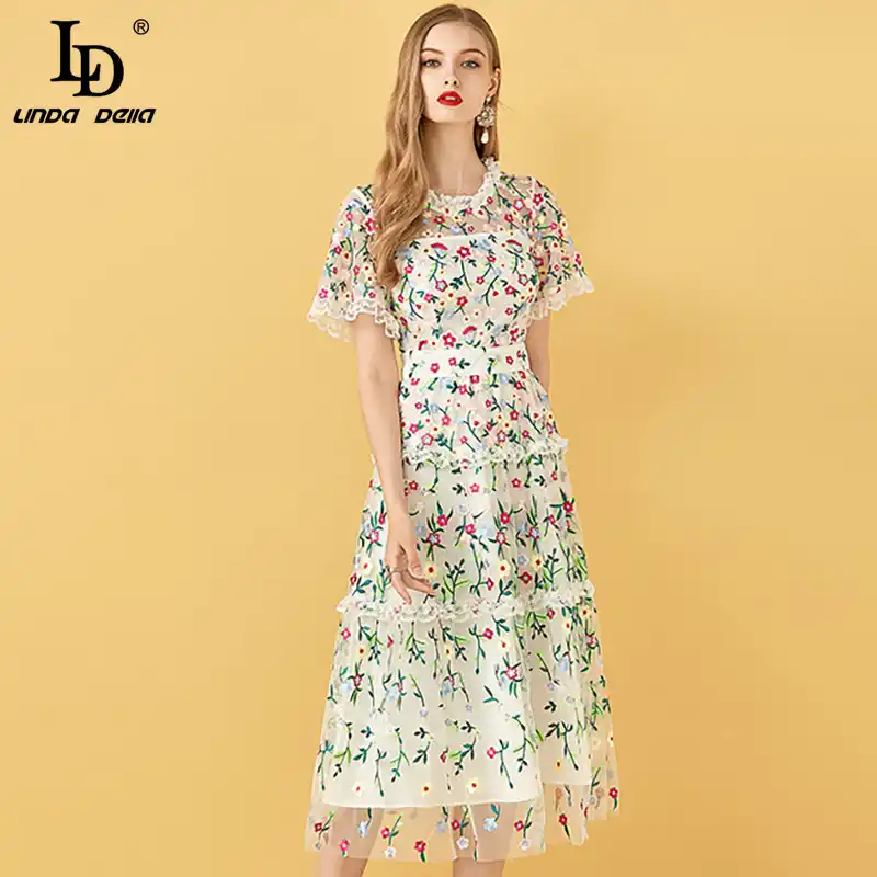 Ld Linda Della Sommer Fashion Runway Vintage Kleid Frauen Tiered Spitze Mesh Ruschen Blumen Stickerei Kleid Damen Midi Kleider Kleider Aliexpress