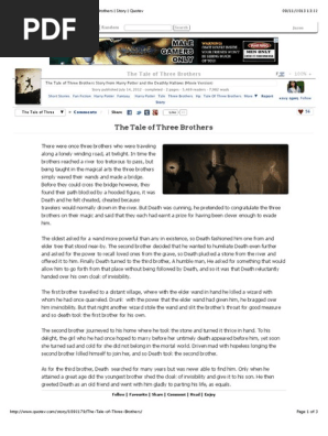 Read the tale three brothers named Tanyen, Zhoshu and Penhun Tenyan was hard working, but the other two brothers were lazy and how Tenyan with his hard work got a big fortune. Finally, after his long tirade, the Pardoner returns to the three young rioters, who are drinking at a tavern when they hear the bell signaling the sound of a passing coffinA servant tells them that the dead man was a friend of the revelers who had been stabbed in the night by a thief called DeathThe revelers declare that they will seek and slay this false traitor Death. The Tale of the Three Brothers The final of the Beedle tales, the Tale of the Three Brothers is the crux of the entire final book, Harry Potter and the Deathly Hallows, as it the origin of the legend of the three deathly hallows, the indestructable Invisibilty Cloak, the Resurrection Stone, and the Elder Wand.