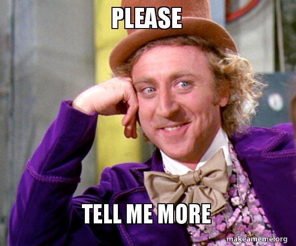 Images tagged "tell me more" Make your own images with our Meme Generator or Animated GIF Maker Create Make a Meme Make a GIF Make a Chart Make a Demotivational Flip Through Images fun fun politics gaming repost cats sports reactiongifs more streams. The most famous meme, connected with the story discussed is condescending Wonka meme Usually, it is used when trying to show the sarcastic mood or attitude towards a certain situation or opinion As far as sarcasm is highly popular these days, the “please tell me more” meme became the real king of the Internet memes. But let us know if you want just one side!.