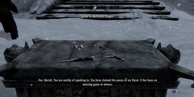 RELATED Skyrim The Cursed Tribe Quest Walkthrough That second trait belongs to Mehrunes' Razor, arguably one of the best daggers in Skyrim It can be obtained from the "Pieces of the Past" quest Players will have to explore the far reaches of Skyrim to find all three pieces and, with the help of Mehrunes Dagon, reforge the blade. Roll Random Texture Pack!. Mehrunes' Razor, also known as The Dagger of the Final Wounds, Bane of the Righteous and Kingslayer, is a Daedric artifact found in The Elder Scrolls V Skyrim The dagger is one of the artifacts and namesakes of Mehrunes Dagon.