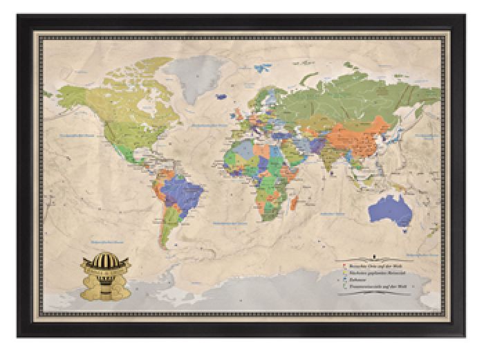 Ihr könnt auch Pins setzen oder Fäden ziehen Die Leinwand wird noch persönlicher mit Fotomagneten von all euren Reisen!. Die ReiseWeltkarte Deluxe ist eine tolle Geschenkidee für alle, die gern reisen und noch einige Ziele ansteuern möchten Die sehr edle und hochwertig gefertigte Weltkarte hat einen schönen dunklen Holzrahmen und kommt auch in großen Räumen durch ihre Maße toll zur Geltung Die personalisierte Plakette macht die Weltkarte zu einem individuellen Geschenk Die verschiedenen Stecknadeln und. Die ReiseWeltkarte mit persönlicher Gravur ist die perfekte Überraschung für alle, die gern reisen und nicht genug von neuen Ländern und Kulturen bekommen Die ReiseWeltkarte zeigt mit 50 Stecknadeln alle bereits besuchten Orte und stellt auch neue Ziele anschaulich dar.