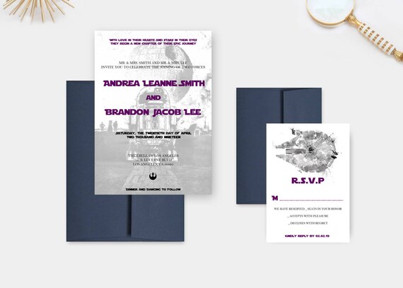 Incorporating this theme into your wedding decor is easy and fun. Star Wars Wedding Invitation Wedding Invitation Template Galaxy Wedding Invite Printable Luke Skywalker Princess Leia Jedi papernpeonies From shop papernpeonies 5 out of 5 stars (1,614) 1,614 reviews $ 3500 FREE shipping Favorite Add to New Handmade Star Wars YODA May The Force Be With You Wedding Garter Navy Blue Black Royal. The little icons represent Jedi Order (good) and Galactic Empire (bad) The Jedi Order icon is on the left of the reply card, indicating the guests were attending The Galactic Empire icon is on the right to indicate the guests could not attend Star Wars meets class Truly, oneofakind wedding invitations.