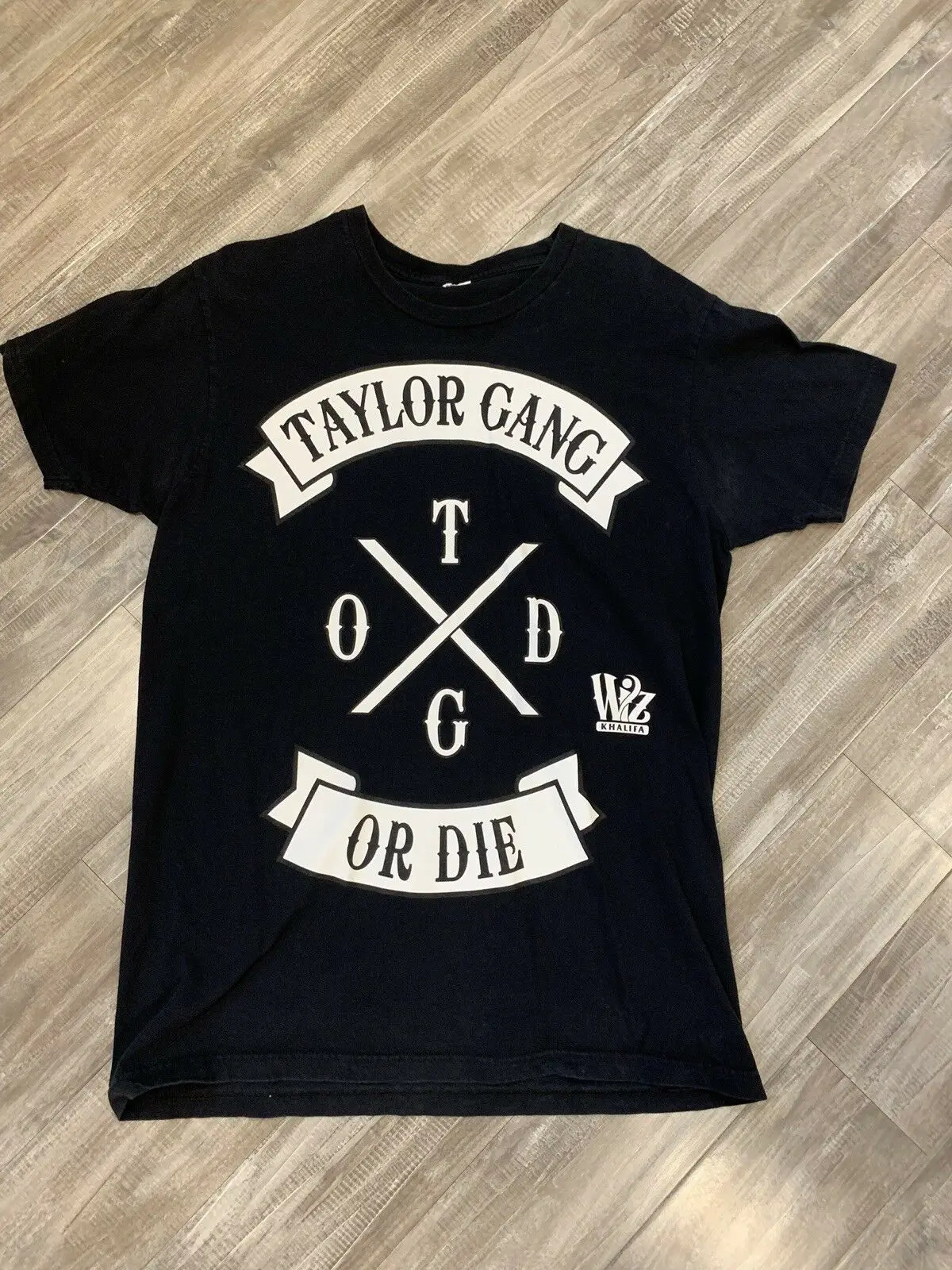 Taylor Gang Ent is an American entertainment company It operates as an independent record label, music management, music production and film company based in Pittsburgh, Pennsylvania founded by rapper Wiz Khalifa The record label is home to artists such as Wiz Khalifa, Berner, Tuki Carter, JR Donato, Kris Hollis, and Academy Award winner and former Three 6 Mafia member Juicy J who serves. Taylor Gang Ent is an American entertainment company It operates as an independent record label, music management, music production and film company based in Pittsburgh, Pennsylvania founded by rapper Wiz Khalifa The record label is home to artists such as Wiz Khalifa, Berner, Tuki Carter, JR Donato, Kris Hollis, and Academy Award winner and former Three 6 Mafia member Juicy J who serves. ITEM SPECIFICS Comfortable Classic Men's Taylor Gang Or Die Wiz Khalifa Hip Hop Rapper Color Block Black TShirt Taylor is in A Red Block, Gang is in A White Block, Then A Yellow Bridge, Or Die is in A Red Block Very Cool & Different, Great Everyday TShirt!.