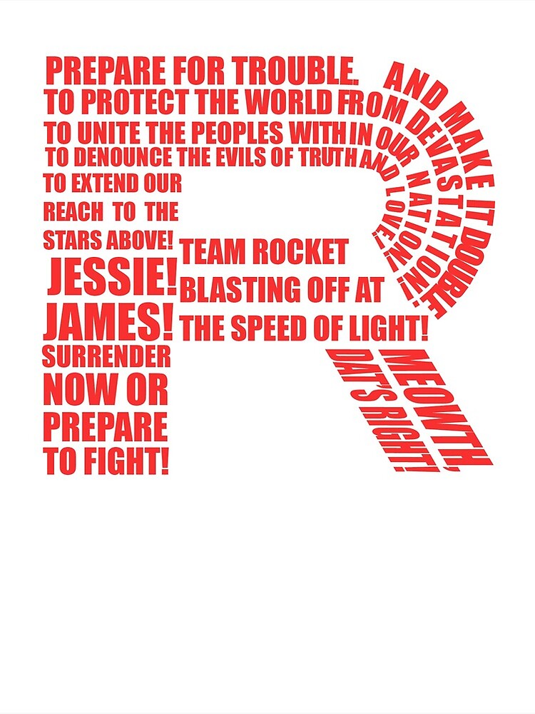 James (continuing to random stuff jessie was saying that is also related to ther actions) Jessie to protect the world from devastation James to unite the people within our nation Jessie to denounce the evils of truth n love James to extend out reach to the stars above Jessie jessie. Well you're in luck, because here they come There are 18 team rocket for sale on Etsy, and they cost $1679 on average The most common team rocket material is cotton The most popular color?. One of Team Rocket's line in their motto "A rose by any other name's just as sweet" is a nod to "A rose by any other name would smell as sweet" which is derived from a famous quote in Romeo and Juliet The anime's Team Rocket dresses different then the game's Team Rocket.