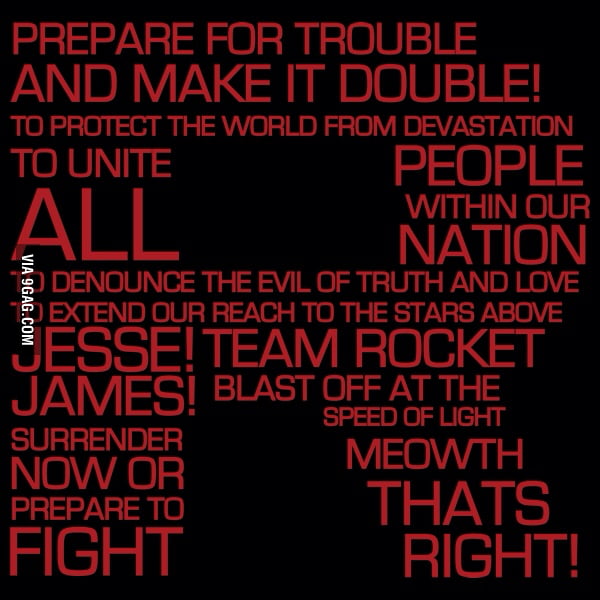 Pokemon 10 Of Team Rocket's Best Quotes, Ranked 10 Motto Team Rocket's Motto makes the countdown for starters There are many versions of this quote throughout the 9 The Team's Farewell Motto Next, when the team's plan is foiled or something unfortunate befalls them, they have a 8 Pokemon. Make it doubleTo protect to world from devastation To Unite all people within our nationTo denounce the evil of truth and love To. Prepare for trouble with all of Team Rocket's different mottos!.