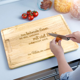 Und klar, da das Schneidebrett mit Wunschtext und Wunschnamen personalisierbar ist, eignet es sich auch ganz hervorragend als Gravur Geschenk für die anderen Familienmitglieder, zB für Oma, Tante, Schwester und auch für Papa oder Opa ist das Brettchen eine tolle Wahl.