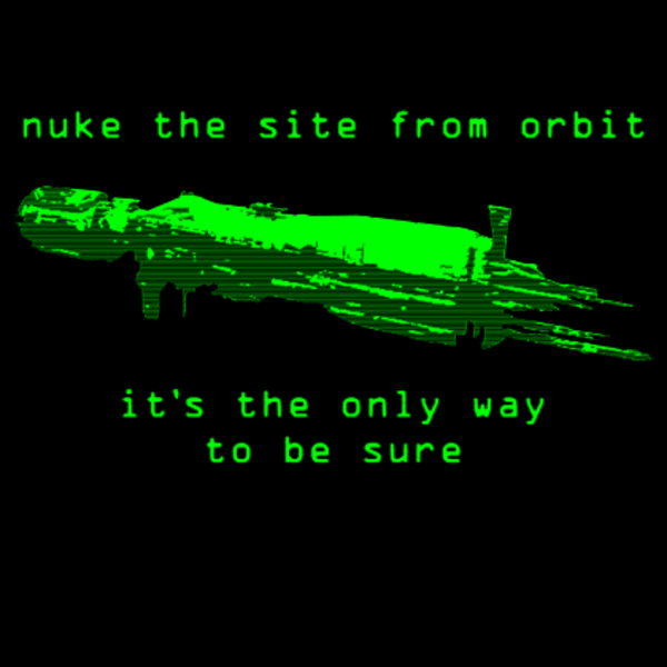 Author Victor de la Cruz Posted on September 27, 14 September 25, 14 Categories Movies s aliens, I say we take off and nuke the entire site from orbit, It's the only way to be sure, movie, ripley, xenomorph. Finally, if I "nuke it from orbit", I get the highest cost and success rate 48 hours labor/downtime, % success rate Then from there, we figure out how much each hour of work/downtime costs, plus add the perincident cost of each exploit, and we start to get an idea of which solution will likely cost the least/most in the long term. Nukefromorbit 2,384 post karma 17,675 comment karma send a private message get them help and support redditor for 5 years /u/nukefromorbit has helped pay for minutes of reddit server time gifts on behalf of /u/nukefromorbit have helped pay for minutes of reddit server time MODERATOR OF.