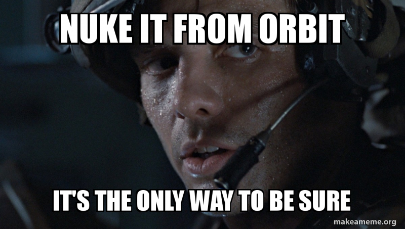 Nuke it from orbit. 8 – Nuke it from orbit Here’s where you are going to have to be VERY brave Note you should have downloaded a full back up of your site Okay, ready, set, breathe – DELETE everything in your public_html folder except the cgibin folder (check for hacked files) and the htaccess file (check for redirects you didn’t enter). Nuke it from orbit, it’s the only way to be sure After the team regrouped, they formed a majority opinion that it was time to cut their losses and “nuke the entire site from orbit” Burke, from the corporation that owned the establishment, protested the decision based on the high value of the asset. A photo purported to capture the elusive Nuke It From Orbit in play Several rounds of this delightful game were enjoyed by all!.