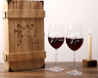 Rotwein Geschenkset mit Namen graviert personalisierte Weingläser mit Flasche Holzkiste mit individueller WunschGravur als Geschenk für Paare zur Hochzeit (Zwei Herzen) 4,6 von 5 Sternen 14 51,95 € 51,95 €. Individuelle Weingläser mit den Namen vom Brautpaar in einer gravierten Holzkiste Sowohl die Weingläser als auch die Holzbox erhalten das gleiche Motiv Das Motiv enthält in der Mitte zwei Ringen, die von Herzen umgeben sind Darüber und darunter werden die Namen des Brautpaares und das Hochzeitsdatum eingraviert. Weingläser in einer Holzkiste als Geschenk zur HochzeitWeingläser mit individueller Gravur Aufschrift Abriebfest & Spülmaschinenfest Aufschrift Farbe Milch Weiss Volumen/Fassungsvermögen 460ml Maße Weingläser (H/Ø) 22,5cm / 7,5cm.