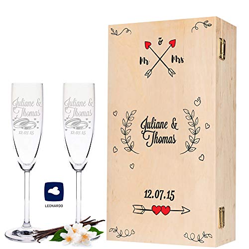 Leonardo Sektglaser Mit Gravur Von Namen Und Datum Im Wedding Design Als Geschenk Zur Hochzeit Verlobung Oder Zum Jahrestag Inkl Gravierter Vintage Holzkiste Das Perfekte Hochzeitsgeschenk