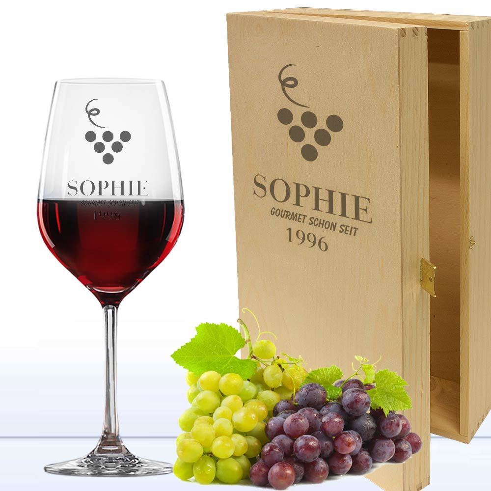 Rotweinglas Vorname Mit Passender Foto Holzkiste Glasartikel Mit Gravur Geschenkegarten
