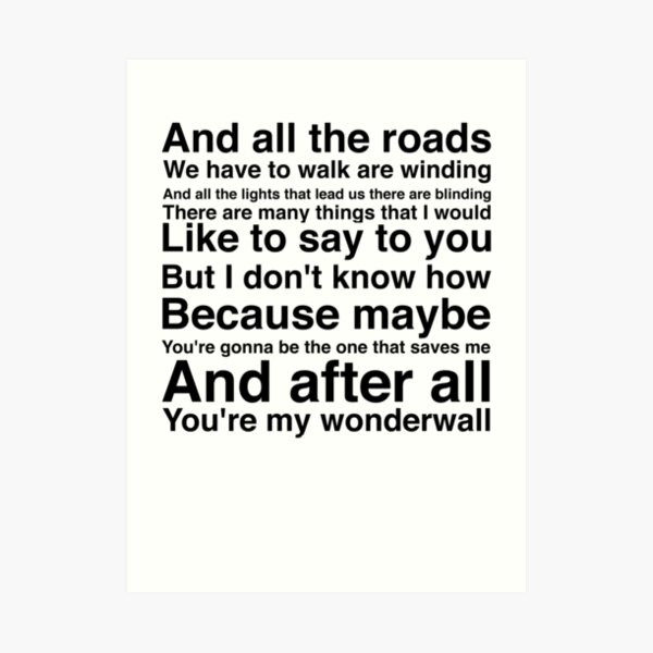 Wonderwall Lyric Print, I said maybe you're gonna be the one that saves me Print, Lyric Poster, Wonderwall Print Various Sizes pencilrewind Sale Price CA$1064 CA$ 1064 CA$ 11 Original Price CA$11" (10% off) Wonderwall Print, I don't believe that anybody feels the way I do about you now, Wonderwall Lyric Print, Poster Various Sizes. And after all Em C Em G Em \ You're my wonderwall Verse Em G Today was gonna be the day D Am But they'll never throw it back to you Em G By now, you should've somehow D Am Realized what you're not to do Em I don't believe G D Am that anybody feels the way I do. You're my wonderwall Verse 2 Today was gonna be the day But they'll never throw it back to you By now you should've somehow Realized what you're not to do I don't believe that anybody.