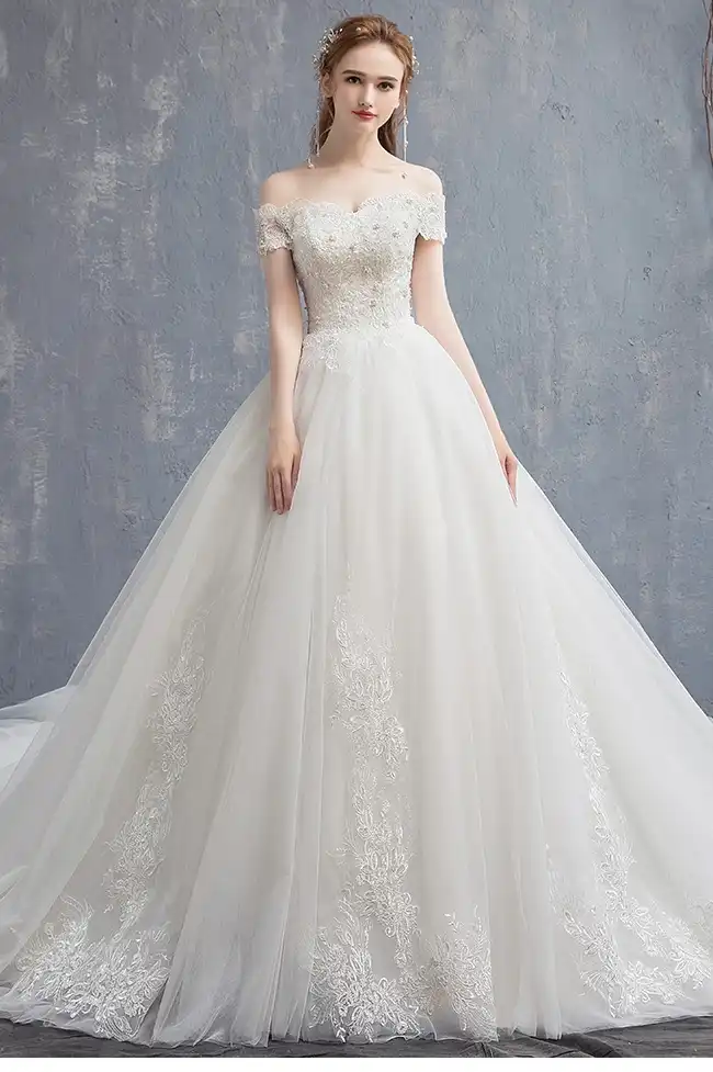 Off The Shoulder Long Train Vintage Wedding Dress Bishop Sleeve