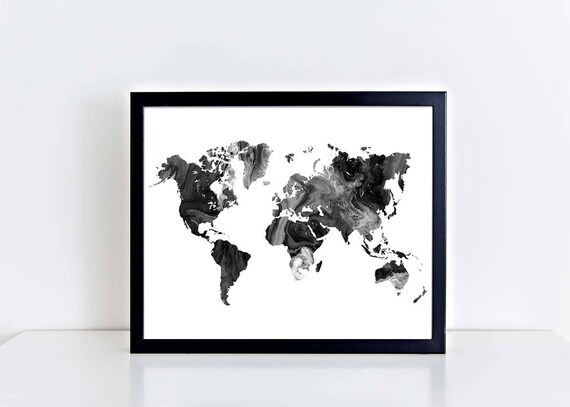 Watercolor World Map Print Printable Black White Wall Art Etsy Water Color World Map World Map Art Black And White Wall Art