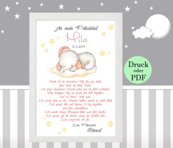 Personalisierte Taufgeschenke für Mädchen vom Paten Du wurdest gebeten, Taufpatin oder –pate zu werden?. Dann habe ich hier das perfekte Geschenk und eine tolle Erinnerung an die Taufe für euch Es ist ein Patenbrief mit einem Taufversprechen und ein tolles Geschenk für das neue Patenkind Der kleine Elefant macht die Patenurkunde zu etwas ganz Besonderem. Geschenke zur Geburt und Taufgeschenke Geschenke zur Geburt und Taufgeschenke Entdecken Sie alle unsere Geschenke zur Geburt und Taufgeschenke vom personalisierten Geburtsrahmen bis zum bestickten Babysessel, vom personalisierten Besteckset mit großer Motivauswahl zum Etui für die Geburtsurkunde, von namensgravierten Kinderarmbändern über Taufmedaillen bis hin zu Geburtskissen wir.