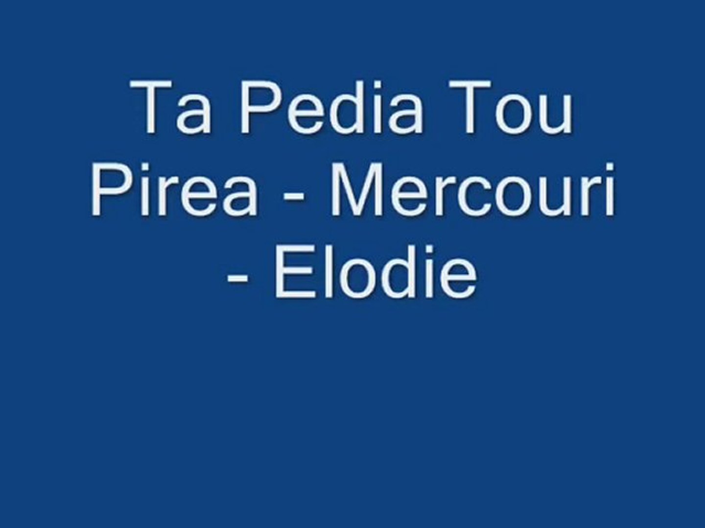 Lyrics for Ta pedia tou pirea by Nana Mouskouri Ap'to parathiro mou stelno ena dio Ke tria ke tessera filia Pou ftanoun sto limani ena ke dio Ke tria ke tessera poulia Pos tha 'thela na iha ena ke dio Ke tria ke tessera pedia Otan tha megalosoun ola na ginoun Leventes yia hari tou Pirea Oso ki an psazo Den vrisko allo limani Trelli na m' echi kani Apo tou Pirea Pou otan vradiazi Tragoudia m. Melina Mercouri (Greek Μελίνα Μερκούρη, born Maria Amalia Mercouri) (Athens, Greece, October 18, 19 – New York City, March 6, 1994) was an Academy Award nominated Greek actress, singer, and political activistShe was a member of the Hellenic Parliament, and in 1981 she became the first female Minister for Culture in Greece The most important person in her early life was her. Ta Pedia Tou Pirea (The Children of Piraeus (Never on a Sunday) 4 To Kiparissaki (The Young Cyprus Tree) 5 I Timoria (The Punishment) 6 Xypna Agapi Mou (Wake Up My Love) 7 Wei e Rosen Aus Athens (White Rose of Athens) 8 Addio (Ebbe Une Flut) (Farewell Tide) 9 Roseau Dans le Vent, Un (A Reed in the Wind) 10 Retour Napoli (Back to Napoli) 11.