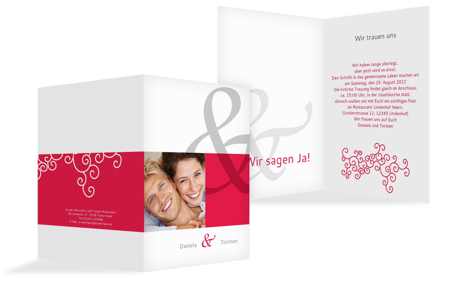Unsere Hochzeit Vorname Sie & Vorname Er heiraten!. 49 (0) 8143 24 19 90 MoFr 0 Uhr service@kartenmachereide Kontaktformular Wo ist meine Bestellung?. Hochzeitskarte aus hochwertigem, rotem DesignKarton mit Linienstruktur und Herz aus silberner Folienprägung sowie auch der Schriftzug Wir sagen Ja in Silberfolie Einweißer Einleger für den Haupttext sowie eine kleinere Karte (für die linke Innenseite) und eine weitere kleine Karte für die Vorderseite werden inkl passendem Bändchen mitgeliefert.