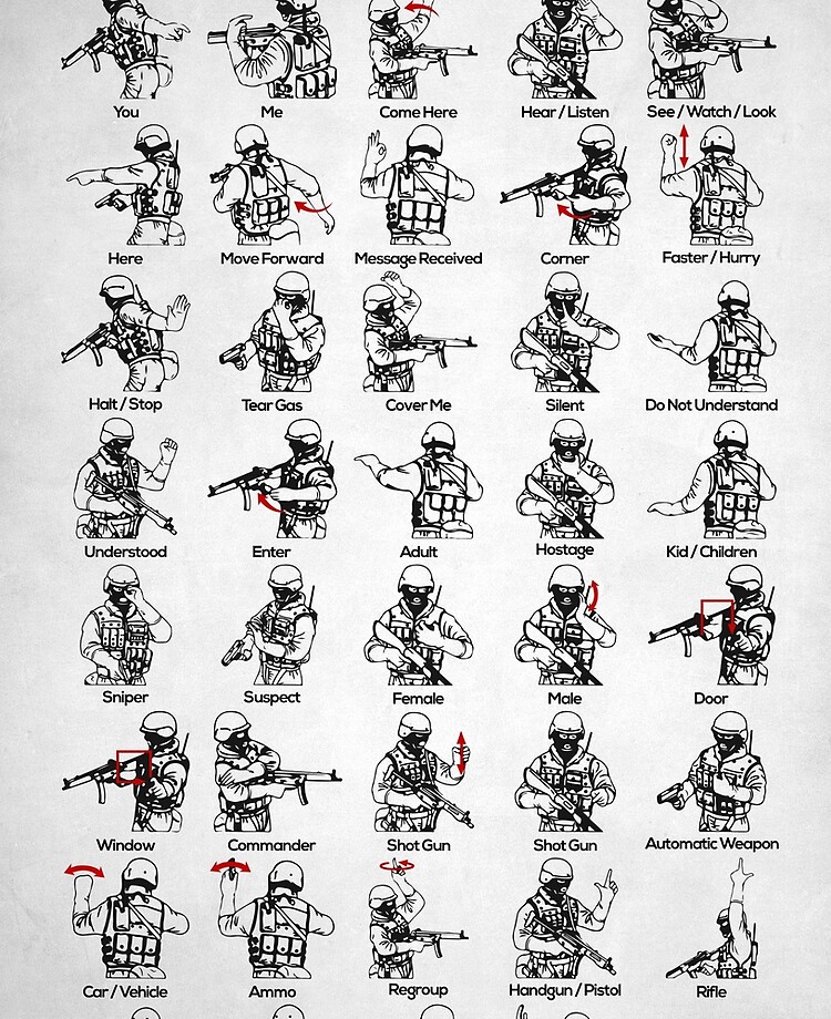 Hand Signals Dog Don't Worry / Disregard Single File Single Line (Perpendicular to Enemy) Two Elements VShaped (Wedge) Formation One Two Three Four Five Six Seven Eight Nine. Tactical Hand Signals is a piece of digital artwork by Zapista which was uploaded on December 15th, 17 The digital art may be purchased as wall art, home decor, apparel, phone cases, greeting cards, and more All products are produced ondemand and shipped worldwide within 2 3 business days. Military Hand and arm signals or what is also called Visual signals were first made by the US Army for field use and are nowthe most common forms of communication during ops Military signals had a recent update from 30 years ago to keep up with needed changes in operations techniques It should be noted that units will also create some of their own signals and.