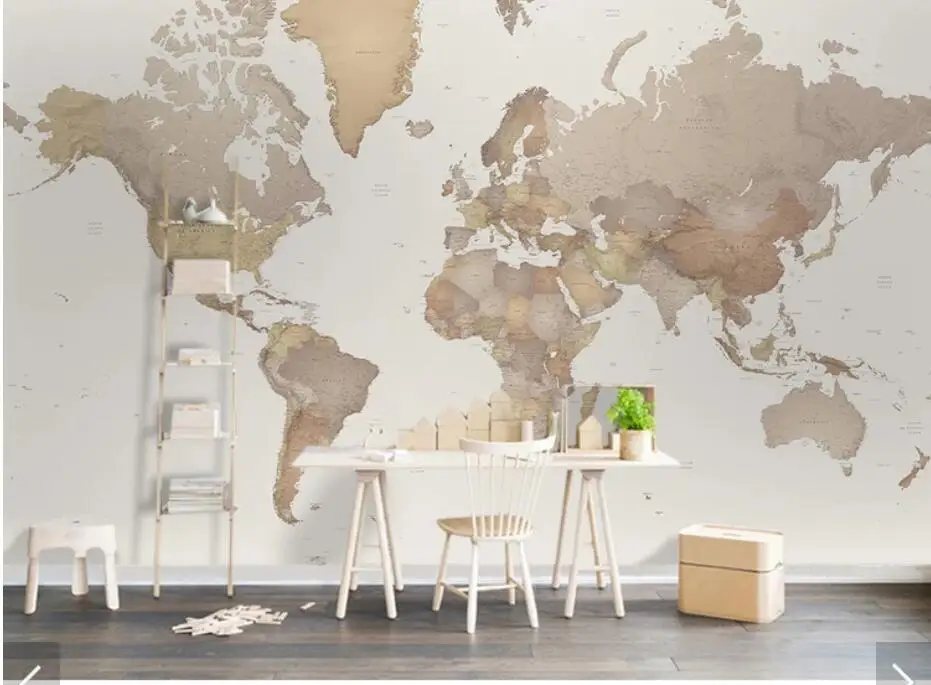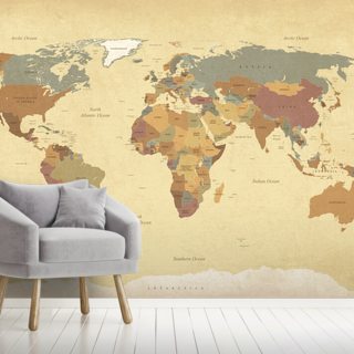 Our classic world map wallpaper is a beautiful vintage design, styled like an old retro globe or textbook map, combining wonderful colour with superb detail all over This is a glorious mural that will give you that amazing feature wall in any room of the home, the neutral tones mean it will effortlessly match your room’s colour palette.