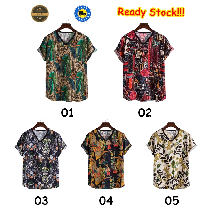 Ready Stock Men S Summer New Fashion Casual Pritned T Shirt Batik Short Sleeve Floral V Neck Large Size T Shirt Shopee Singapore