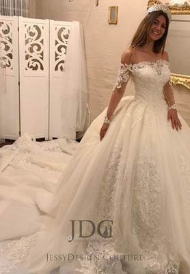 Ivory Spitze Brautkleid Hochzeitskleid Langarm Off Schulter Lange Schleppe Weiss Ebay