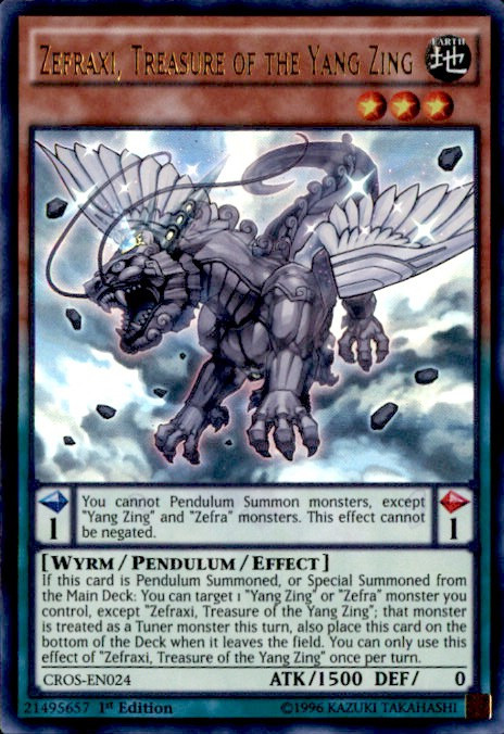 Crossed Souls The Yang Zing Pendulum Swings April 30th, 15 The Zefra are a superteam of new monsters that unite Shaddolls, Ritual Beasts, Nekroz, ‘tellarknights, and the Yang Zing through the one thing they’ve all never had – Pendulum Summons. This card gains these effects, based on the number of different Attributes the "Yang Zing" monsters in your Graveyard have 2 or more All "Yang Zing" monsters you control gain 500 ATK 3 or more If a "Yang Zing" monster(s) you control would be destroyed by battle or card effect, you can send this card to the Graveyard instead 4 or more Your opponent cannot Set monsters. Property Text Target 3 "Yang Zing" monsters in your Graveyard;.