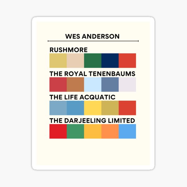 In anticipation of Moonrise Kingdom, designer Beth Mathews created the Wes Anderson Film Color Palette, a chart of the color treatments used in Anderson’s past six films She notes that the filmmaker is true to his brand in every film via Vulture Follow us on Facebook and Twitter. Our new favorite Tumblr combines two of our mostloved subjects Wes Anderson movies and color palettes The creative sites breaks down hyperappealing visuals from Anderson's films into easyto. Wes Anderson Palettes visualizes the many wonderful color schemes that Wes Anderson uses in his films In each post, they take a still from one of Anderson’s iconic films and display the colors seen The Life Aquatic with Steve Zissou.