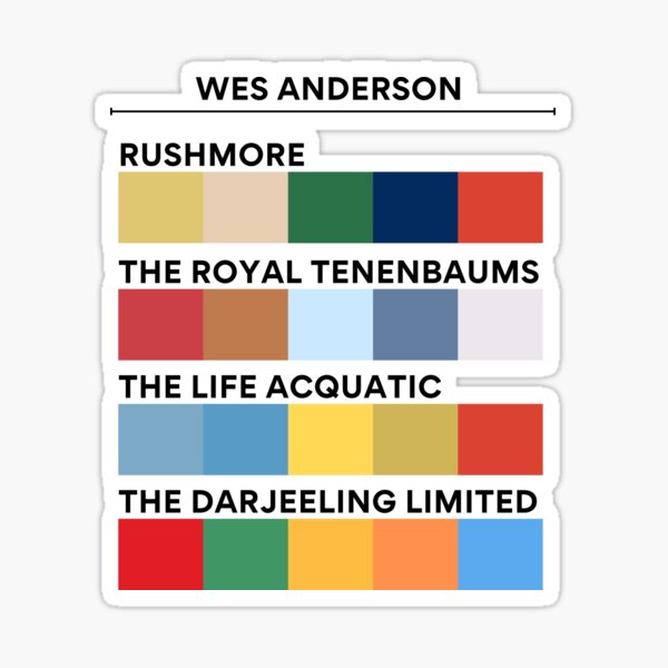 Name of desired palette Choices are BottleRocket1, BottleRocket2, Rushmore1, Royal1, Royal2, Zissou1, Darjeeling1, Darjeeling2, Chevalier1, FantasticFox1, Moonrise1, Moonrise2, Moonrise3, Cavalcanti1, GrandBudapest1, GrandBudapest2, IsleofDogs1, IsleofDogs2 n Number of colors desired Unfortunately most palettes now only have 4 or 5 colors. It's difficult to talk about Wes Anderson's style without talking about the auteur theoryThe director's idiosyncrasies as a cinematic artist have helped introduce the newer generation of filmmakers, film theorists, and cinephiles to auteurism, a theory first developed by French film theorists André Bazin and Alexandre Astruc in the 1940s (the term was coined by American film critic Andrew. If there are two main Wes Anderson colors, it’s red and yellow While it may not be as bright and vivid as his later pictures, Bottle Rocket gave us a taste of what your typical Wes Anderson color palette might look like Throughout the film, Anthony is defined by his signature red sweater Meanwhile, Dignan is usually found in yellow outfits.