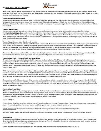 Name Xbox360 Controller KeyRemap Version 21 Date 27/01/12 Author m0m Description ===== This MOD changes the key map of your Xbox360 controller It becomes the following key layout You can also use keyboard shortcuts If you watch a bundled layout image, I think that you easily understand the key layout Please print and use it. Xbox One Rapid Fire Instructions v2 CALL US MONFRI 9AM 5PM EST SALES@CUSTOMCONTROLLERZZCOM. MailIn Mod Chip Installation Service for PS4, Xbox One, PS3, Xbox 360 Instructions Print a copy of your payment confirmation Check your controller version for compatibility before shipping.