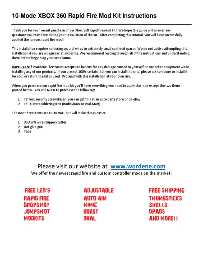 Pull the trigger The package comes with the INTENSAFIRE FlexBoard, the glue, a screwdriver, a toothpick, and written instructions Dual rapidfire 5mode sleeper Easy 3minute installation No soldering or wires required Can be used in all XBOX 360 games. I installed the Dual Button Rapid Fire Mod kit on my older 360 controller I was totally amazed at how easy the tutorial was This kit includes plenty of wire to complete the Mod And if you need any additional assistance just email them and they also sell Pre modded controllers,(just in case you are not comfortable soldering). I recently bought a rapid controller mod kit off ebay does anyone know what parts i need in order to mod the controller myself like theres this chip that i see is that buyable?.