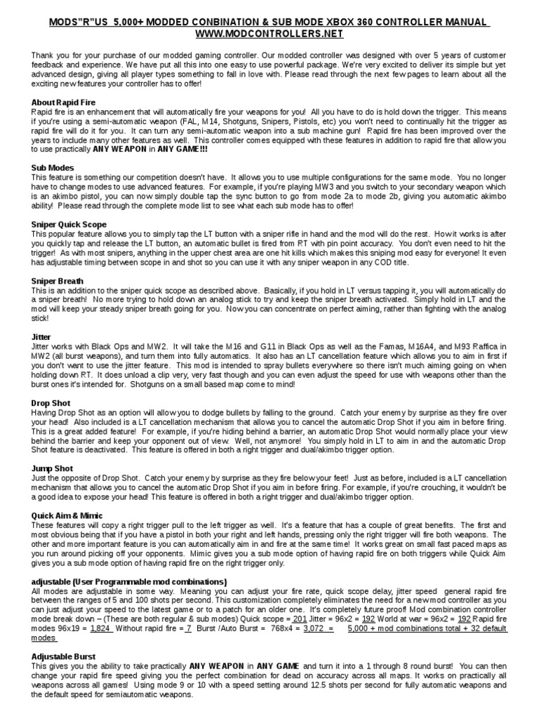 WwwCrazyControllerzcom wwwFacebookcom/crazycontrollerz wwwTwittercom/ccontrollerz Crazy Controllerz Xbox 360 Modded Controller video instruction guide!. If so what is it called?. Drop Shot, Autoaim, Xbox 360 Modded Controller for COD Advanced Warfare,Ghost Black Ops 2, Mw3, Mw2, Rapid Fire Mod(clear Green) Brand Lighting Modz Platform Xbox 360 Rated Rating Pending The instructions may seem a little overwhelming at first for some Its just a typed up sheet of paper and it says how everything works.
