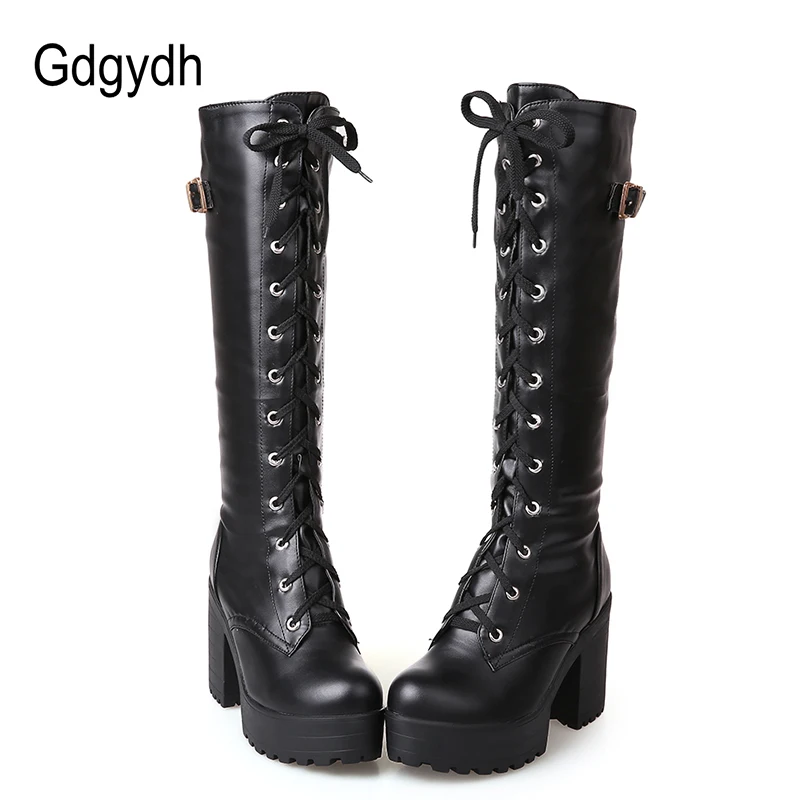 Gdgydh Heisser Verkauf Fruhling Herbst Schnurung Kniehohe Stiefel Frauen Mode Weiss Platz Ferse Frau Leder Schuhe Winter Pu Grosse Grosse 43 Kniehohe Stiefel Aliexpress