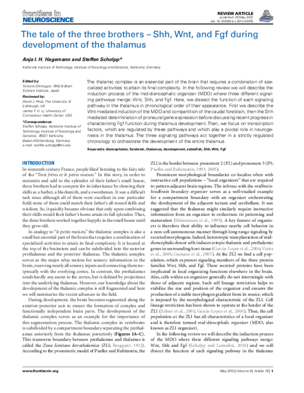Pdf The Tale Of The Three Brothers Shh Wnt And Fgf During Development Of The Thalamus Steffen Scholpp Academia Edu