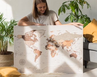 Schlüsselworte Bilder Weltkarte, Braune Moderne Weltkarte Bilder mit Weltkartenmotiv, Detaillierte Karte auf Leinwand, Großartige Weltkarten, Große aufgespannte Leinwandkarte, Leinwandbild, Pin drücken Reisekarte, push pin world, Reisekarte mit Stecknadeln, welkarte Leinwandbild, Welt Pinnwand Karte, Weltkarte für Kinder, Weltkarte World map. Gedruckt auf Leinwand, gespannt auf einen Rahmen aus Echtholz und verstärkt mit einer Rückwand aus natürlichem Kork Unsere Weltkarten als Pinnwand bieten dir die einzigartige Möglichkeit, deine Reisen & Abenteuer festzuhalten Mit Fahnen & Pins markierst du deine Erlebnisse und hast das nächste Ziel immer vor Augen. Weltkarte aus Kork für umweltbewusste Reisende Zudem wird unsere KorkWeltkarte den Ansprüchen umweltbewusster Reisender gerecht Unsere Weltkarte aus Kork stammt aus ökologischnachhaltigem Anbau, ist selbstverständlich für Veganer geeignet und Sie können sie optional auch ohne Klebefolie bestellen.