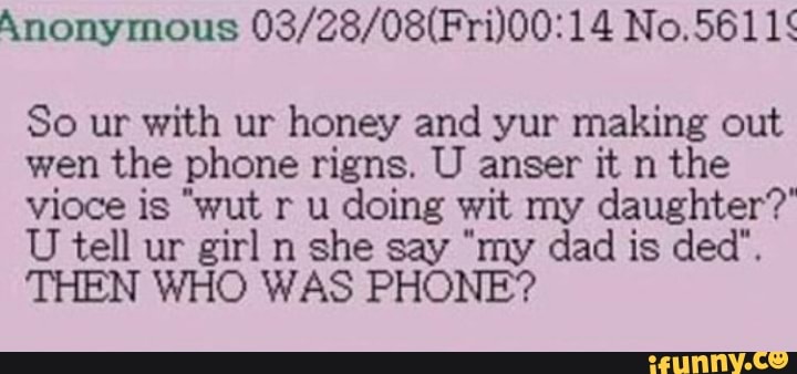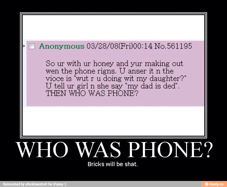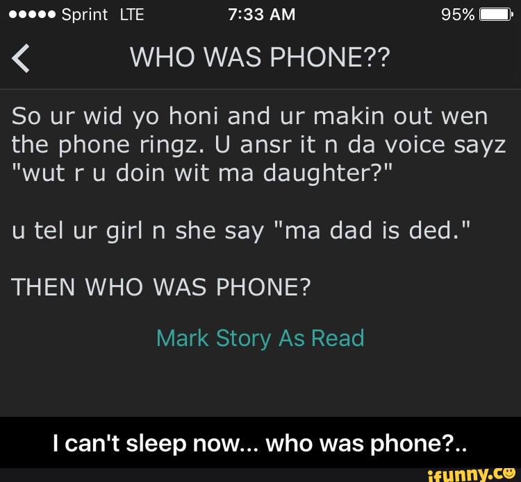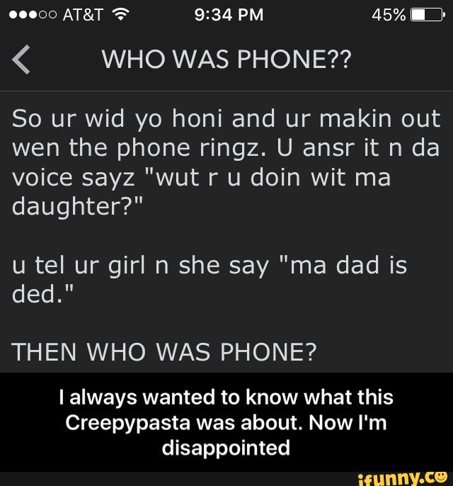 The phrase "who was phone" remains a favorite joke among /x/philes The Pasta So ur with ur honey and yur making out wen the phone rigns U anser it n the vioce is "wut r u doing wit my daughter?" U tell ur girl n she say "my dad is ded" THEN WHO WAS PHONE?. Scary Reading Of Original. Uploaded by bruhinb Add a Comment Comments (2) Display Comments Add a Comment Add an Image Image Details 26,344 views (9 from today) Uploaded Mar 28, 11 at 0132PM EDT Origin Entry THEN WHO WAS PHONE?.
