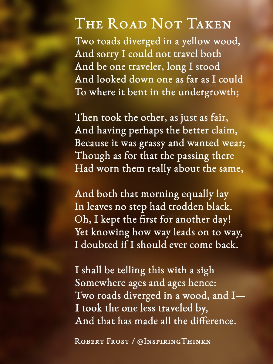 Then took the other, as just as fair, And having perhaps the better claim, Because it was grassy and wanted wear;. Two roads diverged in a yellow wood, And sorry I could not travel both And be one traveler, long I stood And looked down one as far as I could To where it bent in the undergrowth;. Yet knowing how way leads on to way, I doubted if I should ever come back I shall be telling this with a.