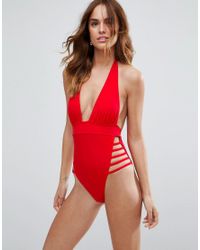 Asos Synthetic Ultra Strappy High Leg Cut Out Plunge Swimsuit In Red Lyst